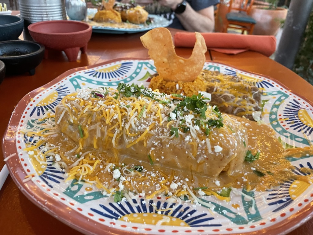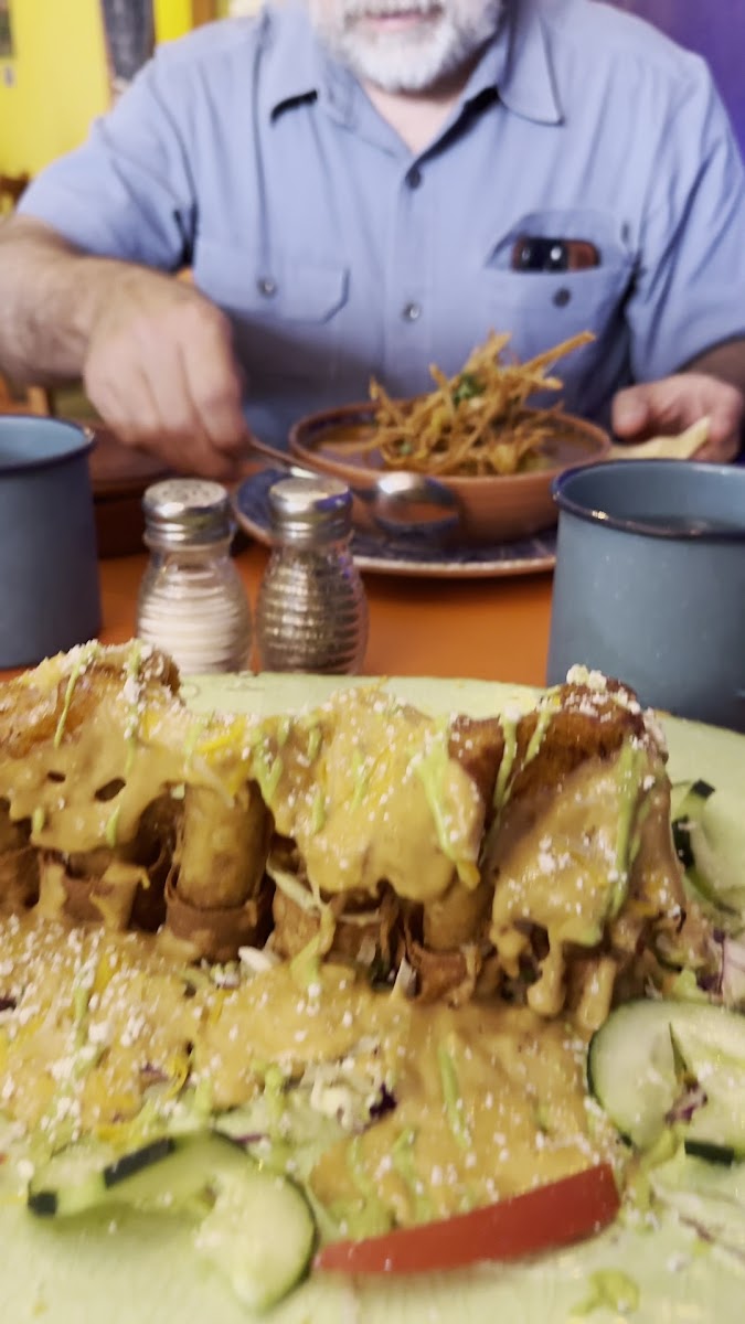 This was the best meal as well as the best Mexican food I’ve had in a very, very long time! The service was exceptional, the establishment was homey and comfortable. The food presentation was beautiful and fun! The variety of beautiful plates each meal was served on was a lovely touch- I only wish I could have taken my plate home with me! Each dish had a fun chip animal shape perched on top. We all had fun checking out each others animal shape. The portions were huge- everyone had enough to bring home for another full meal! We were all stuffed but still ordered dessert because we couldn’t wait to try the decadent carrot cake and the sopapillas- all huge portions and oh so delicious!! I almost forgot to mention how perfect the chips and salsa is too. I only wish we lived close by so we could frequent this gem of a restaurant. If you go (and you most definitely should!) make sure you stop by the kitchen screen door and tell the chef Santa how much you enjoyed her cooking. I got the chicken roasted corn enchiladas, 2 others got the chili rellanos and green chili chicken enchiladas! All fabulous!!!!