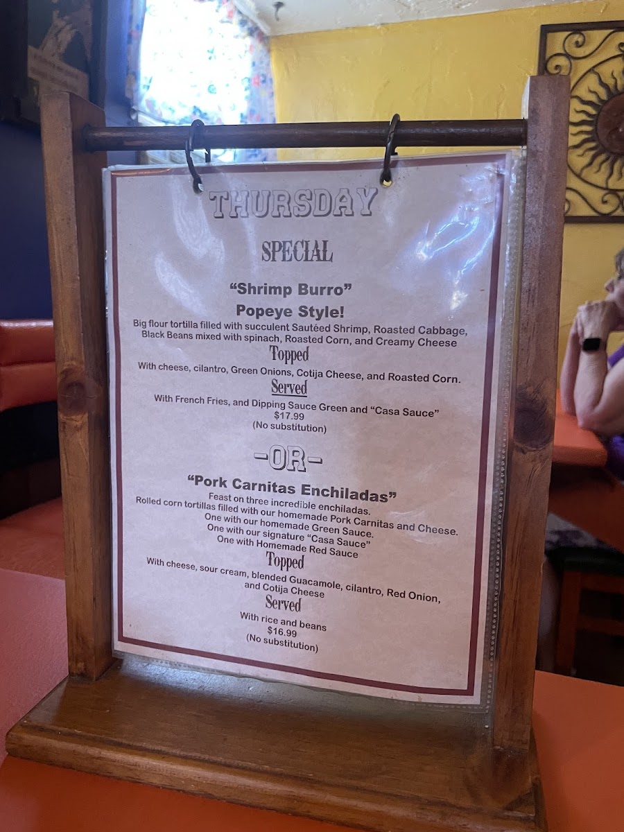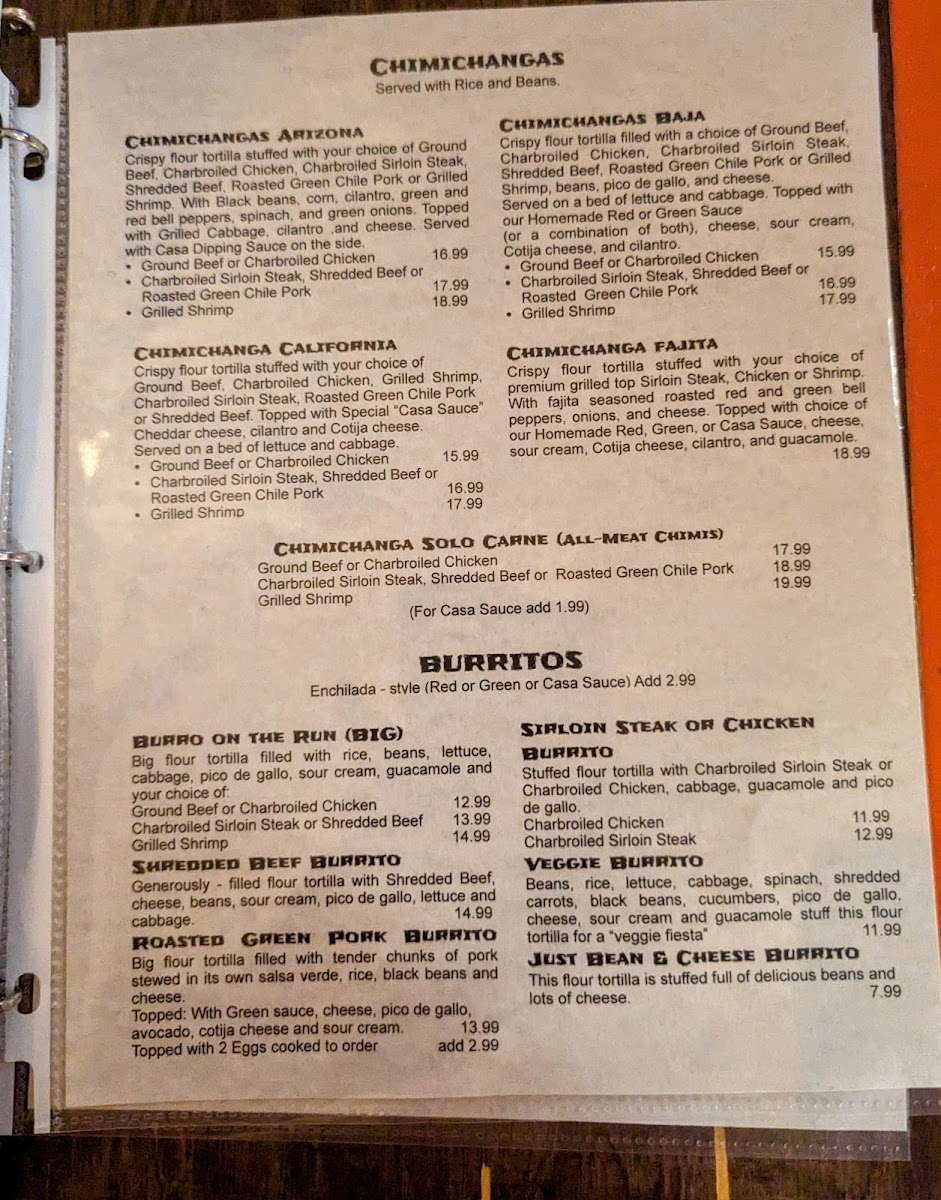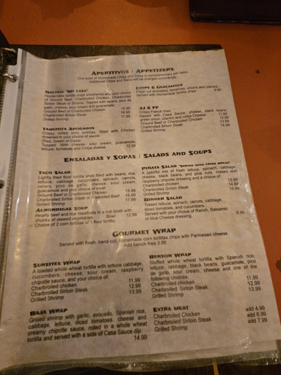 Guests will find a variety of options—from flavorful enchiladas and hearty fajita skillets to fresh taco salads and crispy sopapillas for dessert. Alongside traditional favorites like chips and salsa or chicken fajitas, there are unique dishes like Surf and Turf Enchiladas and Shrimp Tacos Baja Style that complement the warm, inviting atmosphere.